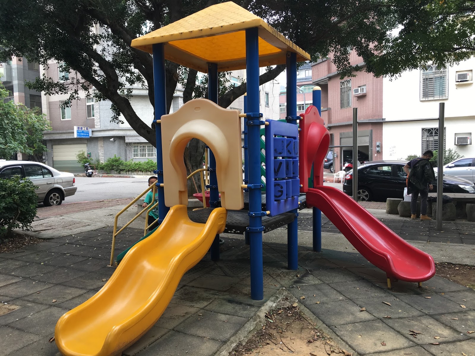 The interesting looking blue playground structure is worth checking out if you have older children who can do monkey bars. There are no traditional slides at this park. My 4.5 yr old enjoyed climbing on the "surfboard", but other than that there was little he could do here. (but he still had a decent time) my 1st & 2nd grader liked this park because of the monkey bars (a hard thing to find around here). Parking was easy on a weekday afternoon, I was able to find street parking right next to the park.